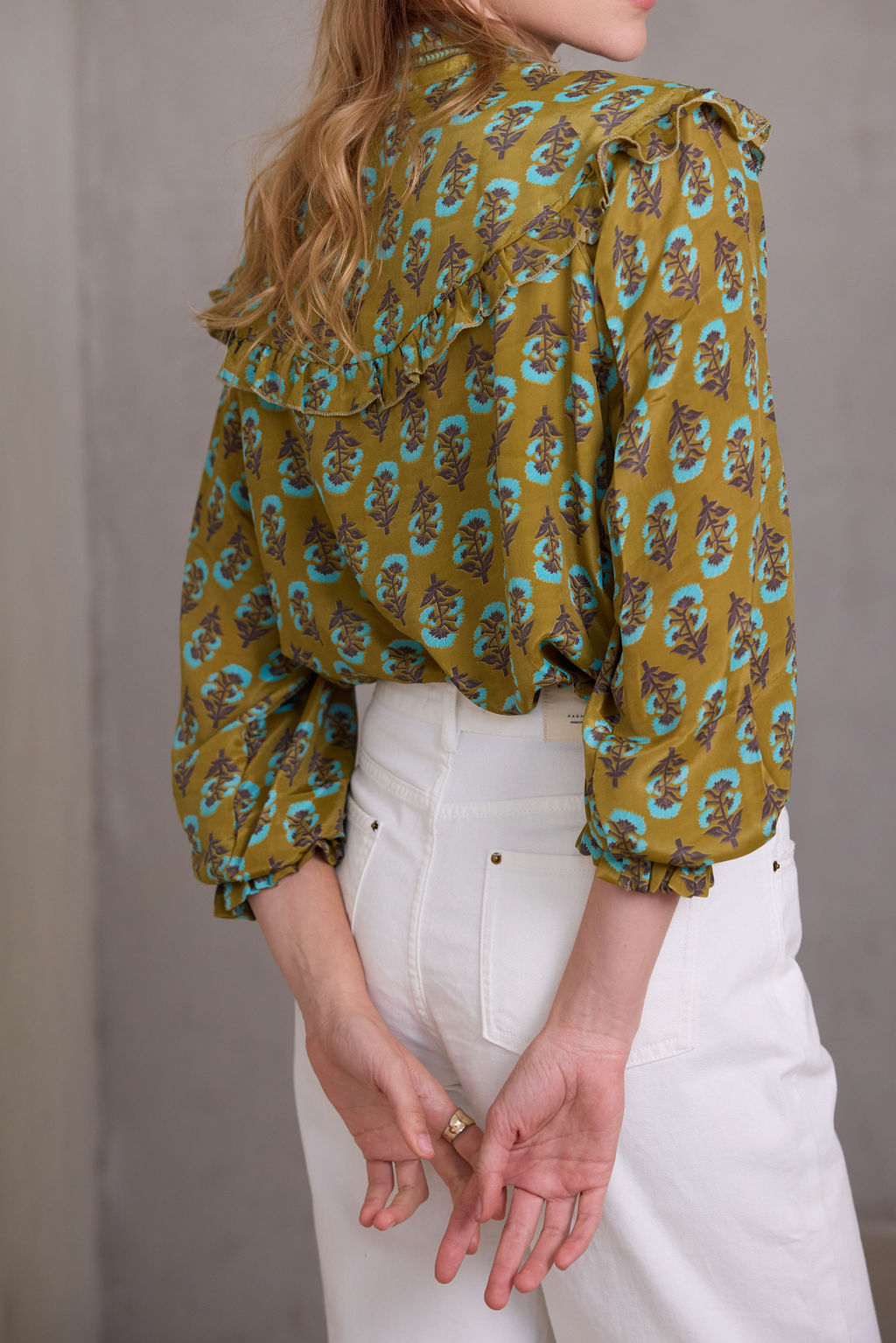 החולצה מתהדרת בצווארון גבוה עם עיטור עדין, חפתים מתכנסים עם פרטים קטנים ושיקיים, וכמובן – רפלס קדמי שמוסיף טוויסט נשי מתוחכם