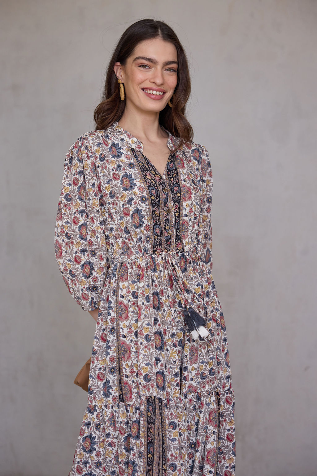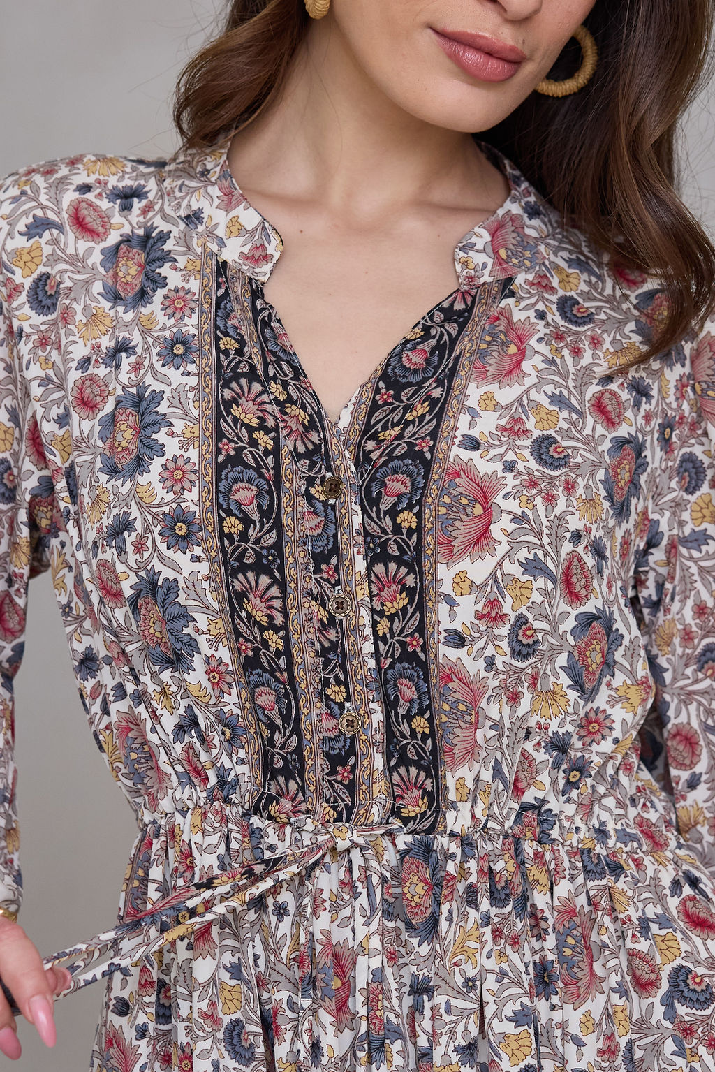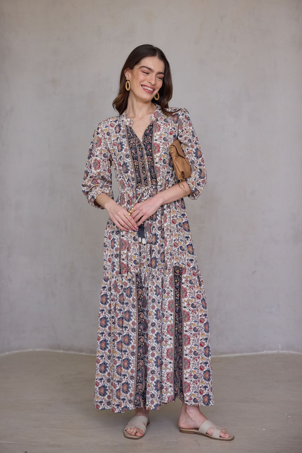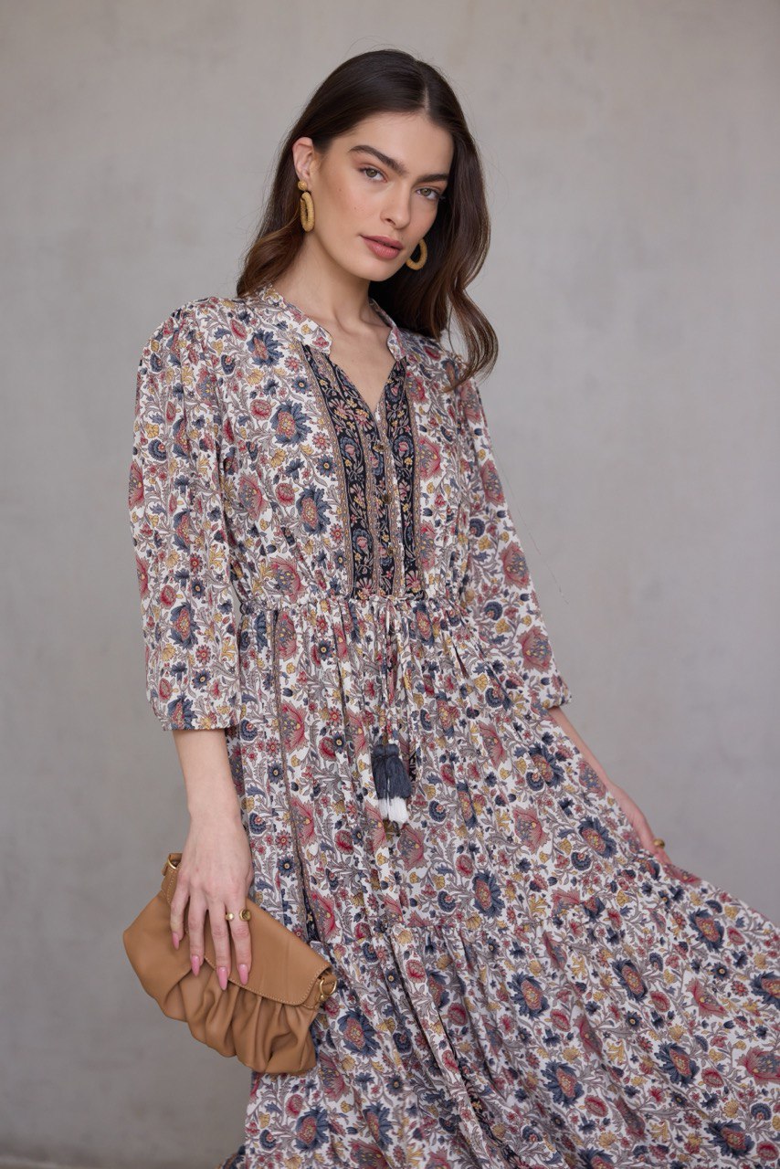 שמלה נשפכת בעיצוב בוהו שיק, עם הדפס ייחודי המעוטר בנגיעות זהב שנוספות למראה האלגנטי.