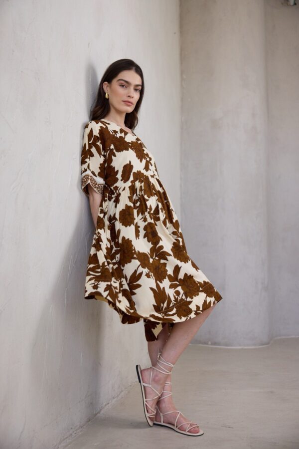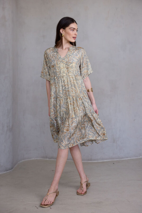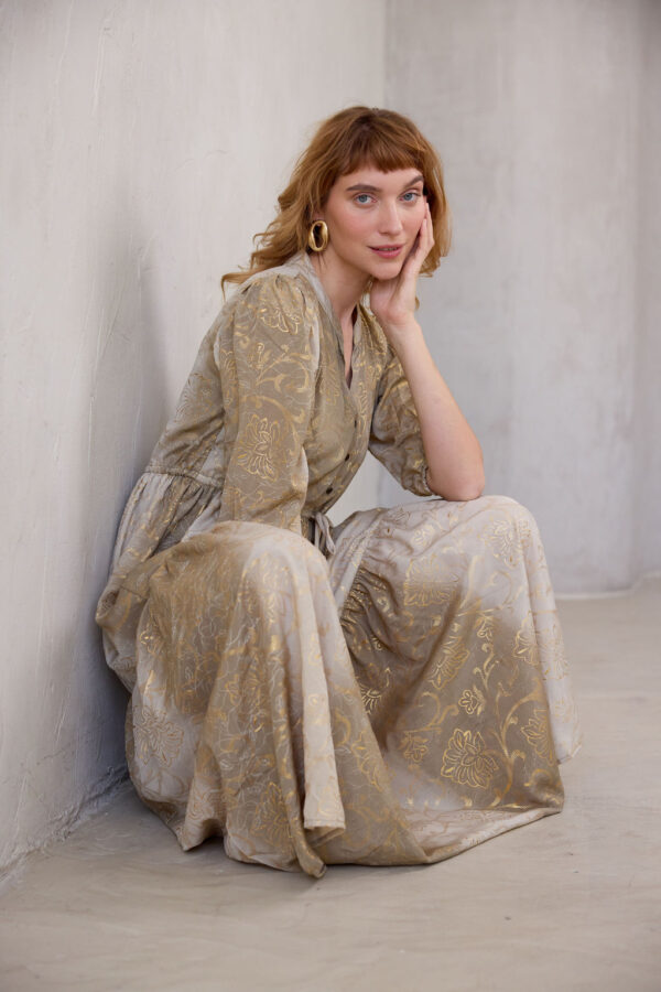 שמלה נשפכת בעיצוב בוהו שיק, עם הדפס ייחודי המעוטר בנגיעות זהב שנוספות למראה האלגנטי.