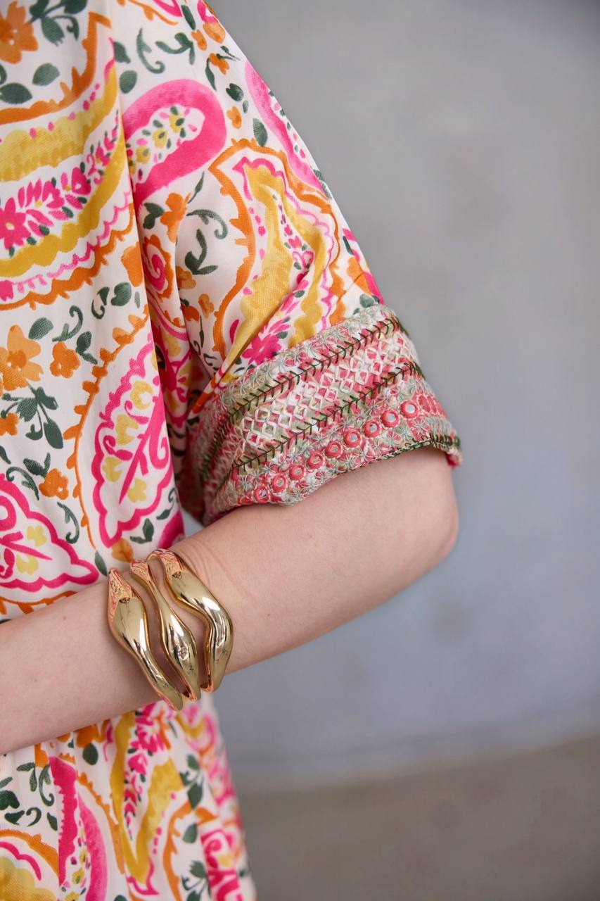 גזרת אוברסייז נוחה ומחמיאה, כפתורים בחלק העליון וסיומת שרוול יוצאת דופן – עם רקמה עשירה שתופסת את העין ומספרת סיפור.