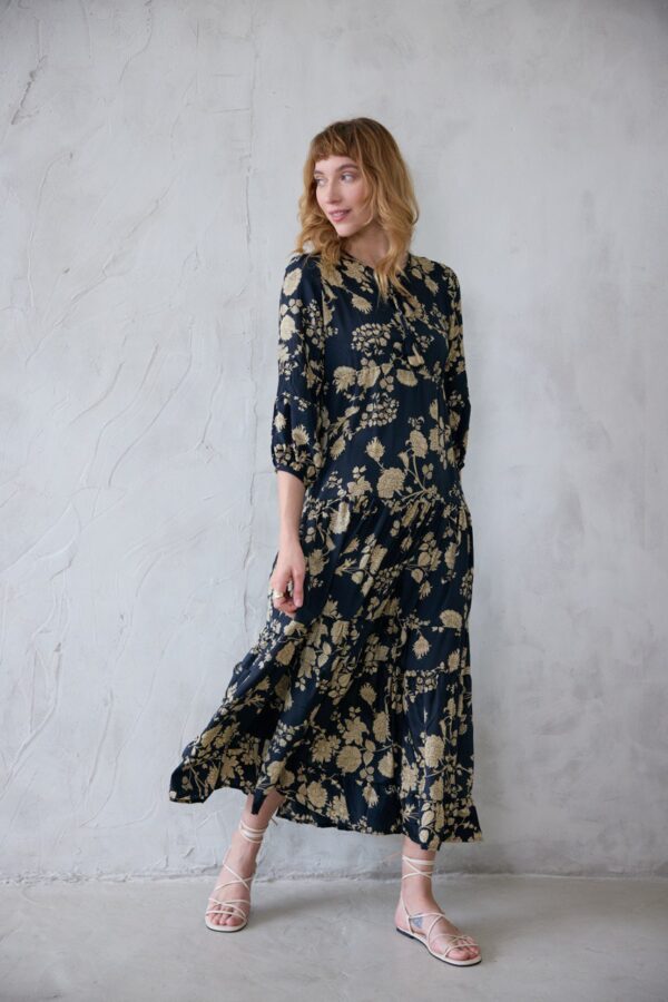 שמלת מקסי ארוכה עם בד מתנפנף בגזרה נשפכת ומחמיאה. קומות הבד יוצרות מראה עשיר ואלגנטי, ושרוולי התפוח עם סיומת הכפתור מוסיפים טאץ’ מחויט ומדויק. השמלה מעוטרת בשרוכים עם גדילים מיוחדים וחרוזים למראה ייחודי ושיק בלתי מתאמץ. מושלמת ליום ולערב