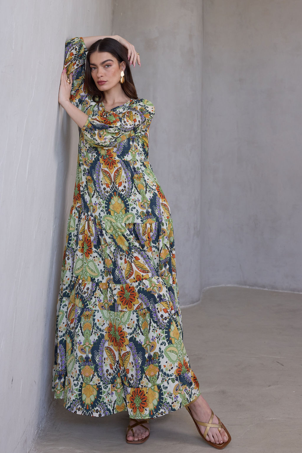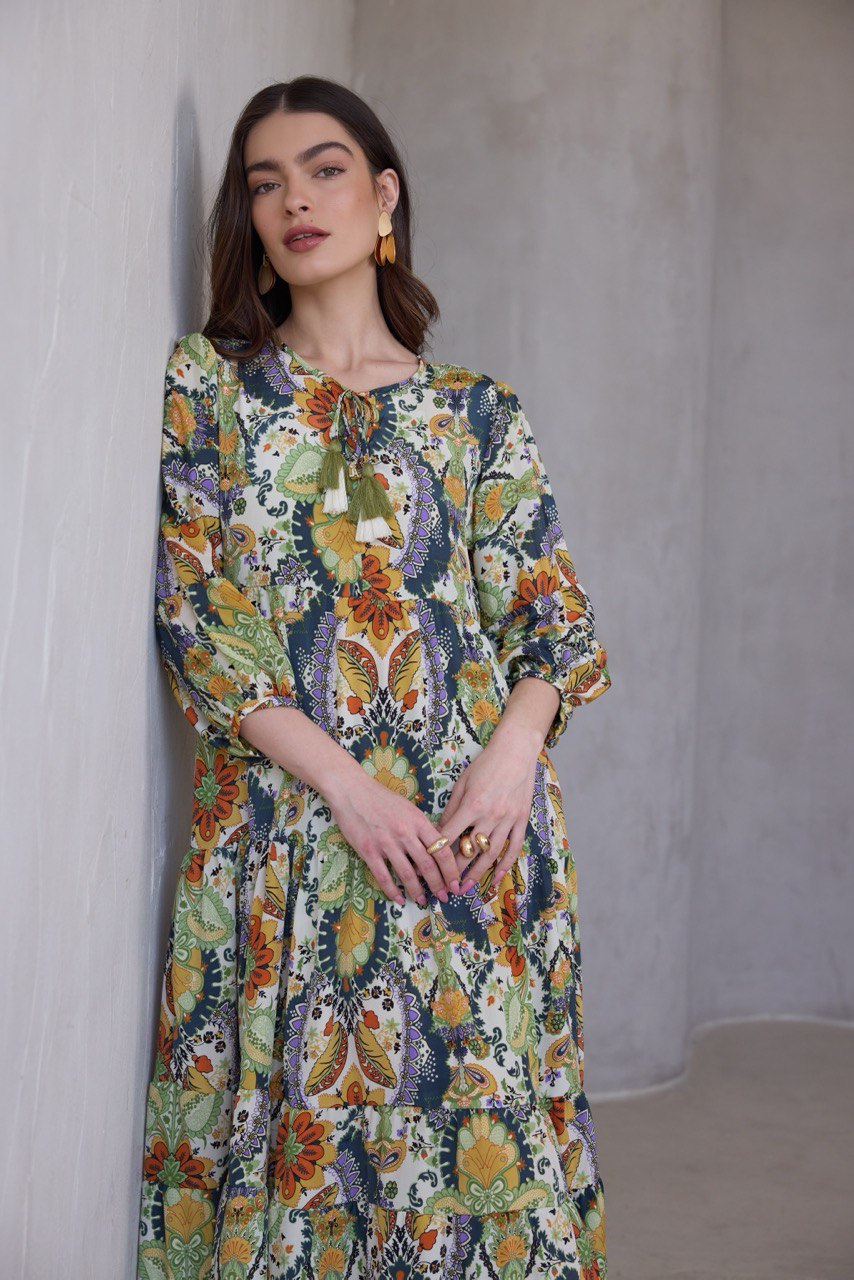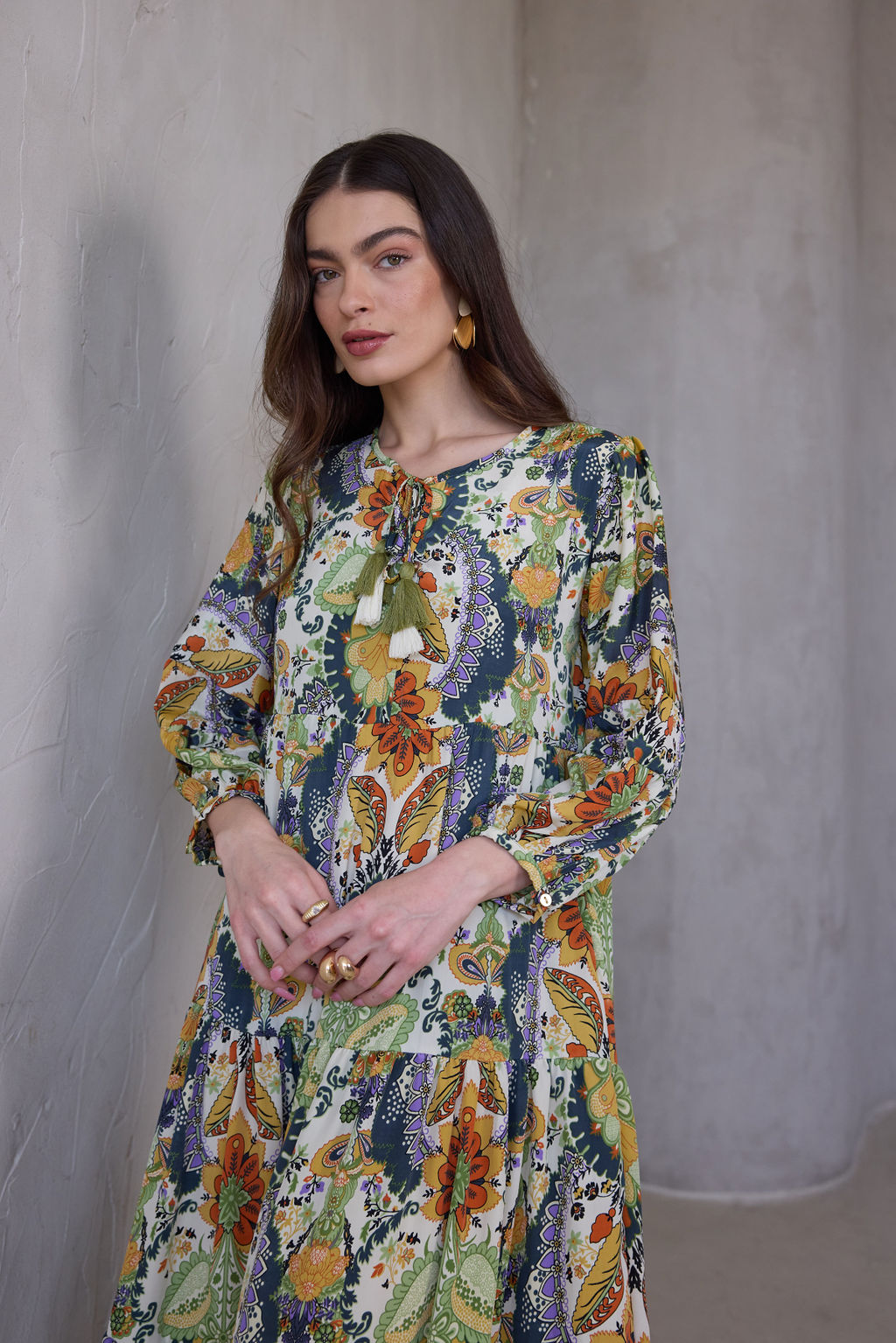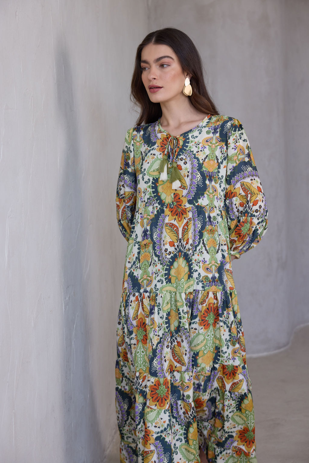 שמלת מקסי ארוכה עם בד מתנפנף בגזרה נשפכת ומחמיאה. קומות הבד יוצרות מראה עשיר ואלגנטי, ושרוולי התפוח עם סיומת הכפתור מוסיפים טאץ’ מחויט ומדויק. השמלה מעוטרת בשרוכים עם גדילים מיוחדים וחרוזים למראה ייחודי ושיק בלתי מתאמץ. מושלמת ליום ולערב