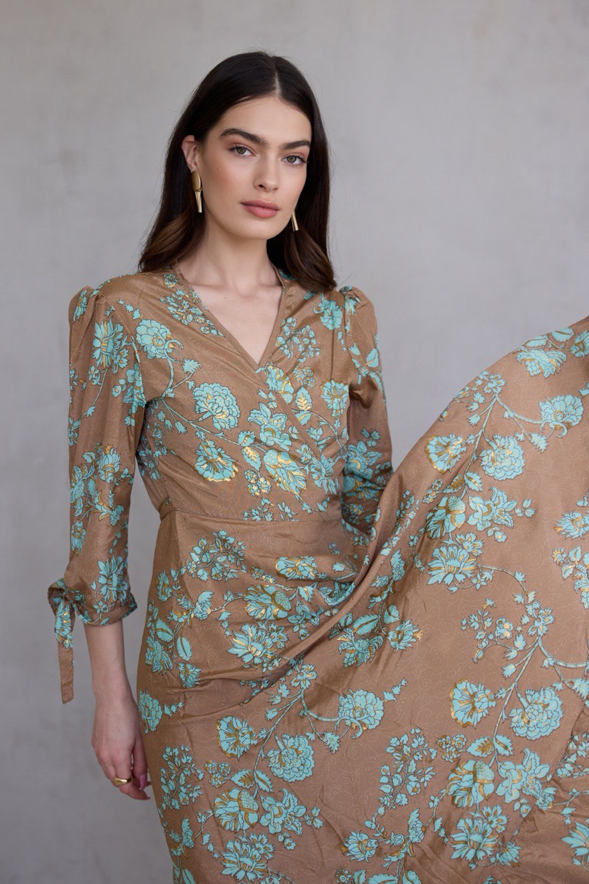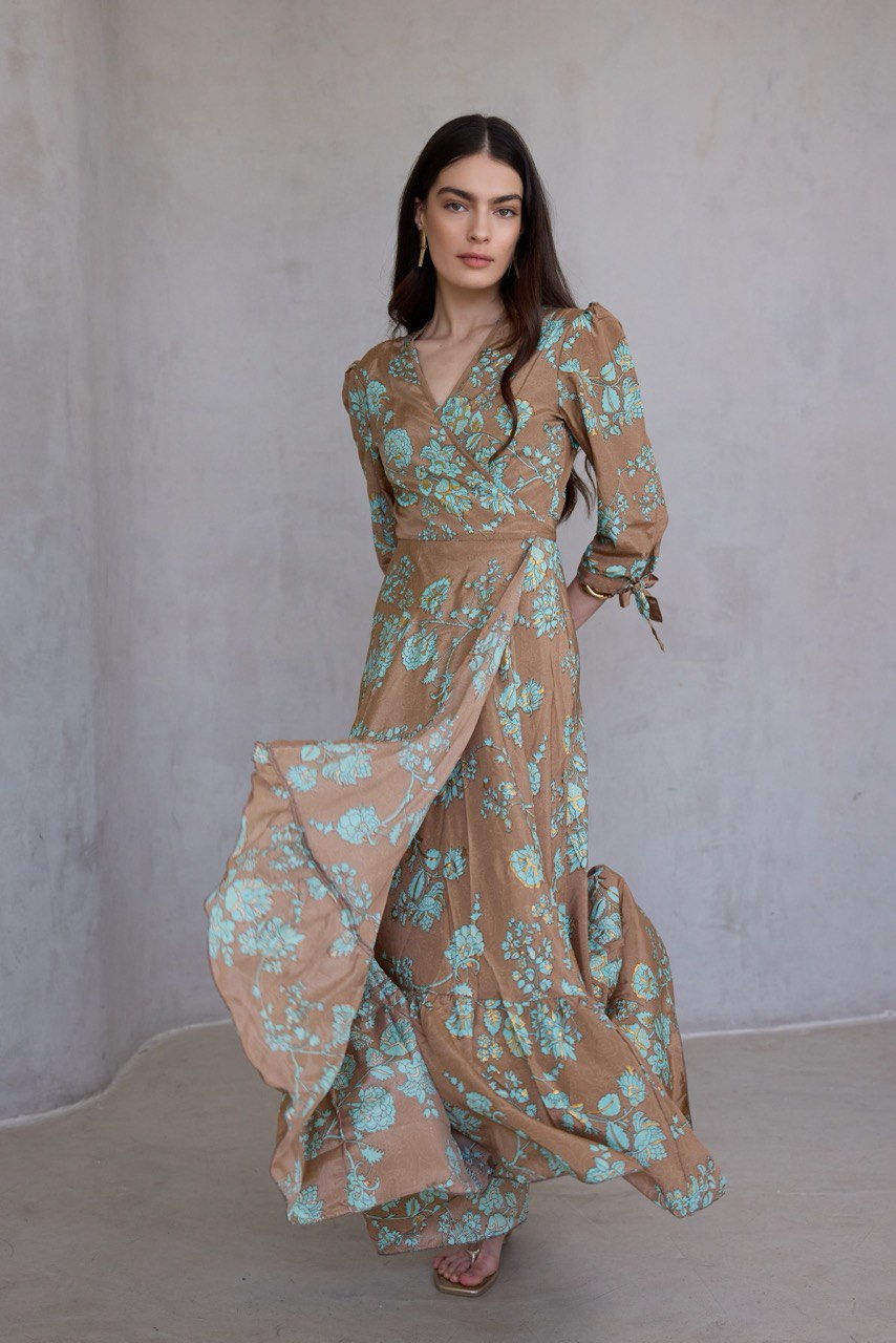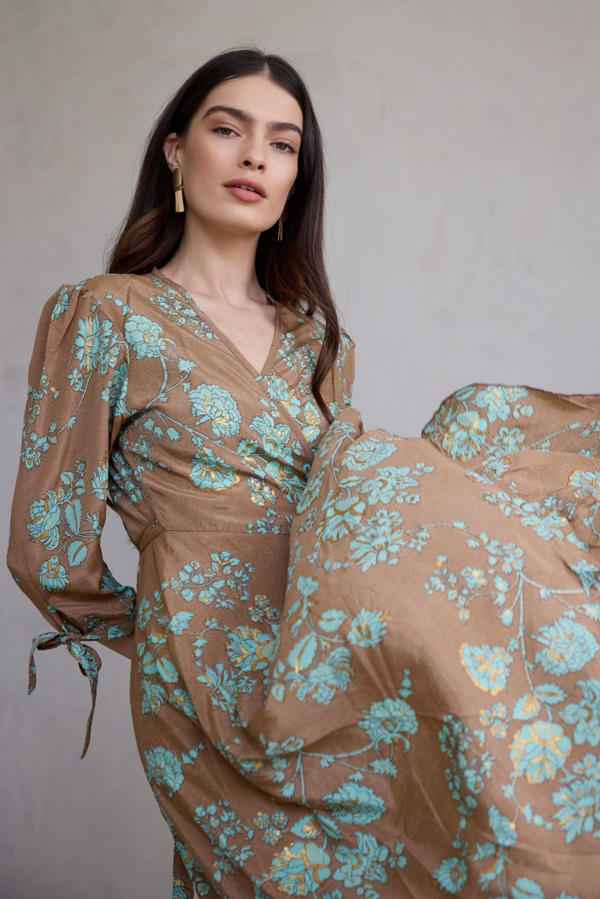 עשויה בד משי מעורב, נופל ומלטף, עם הדפס ייחודי ושכבות , הטבעות זהב עשירות שמעניקות לה זוהר עדין בכל תנועה.