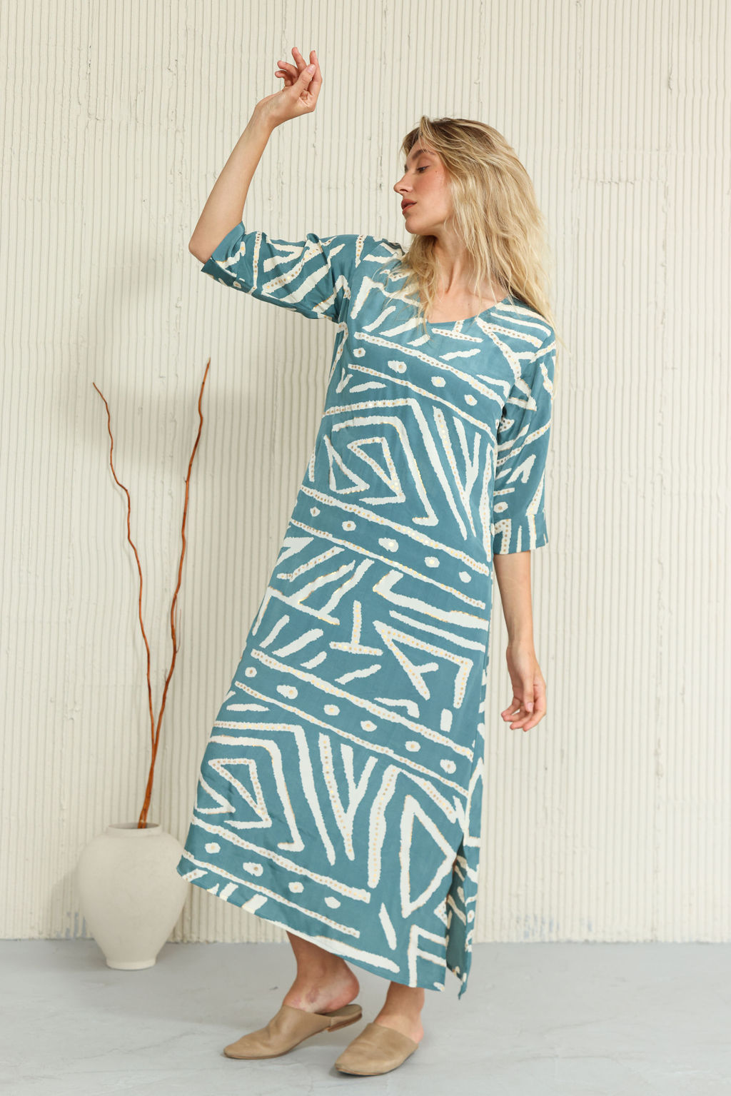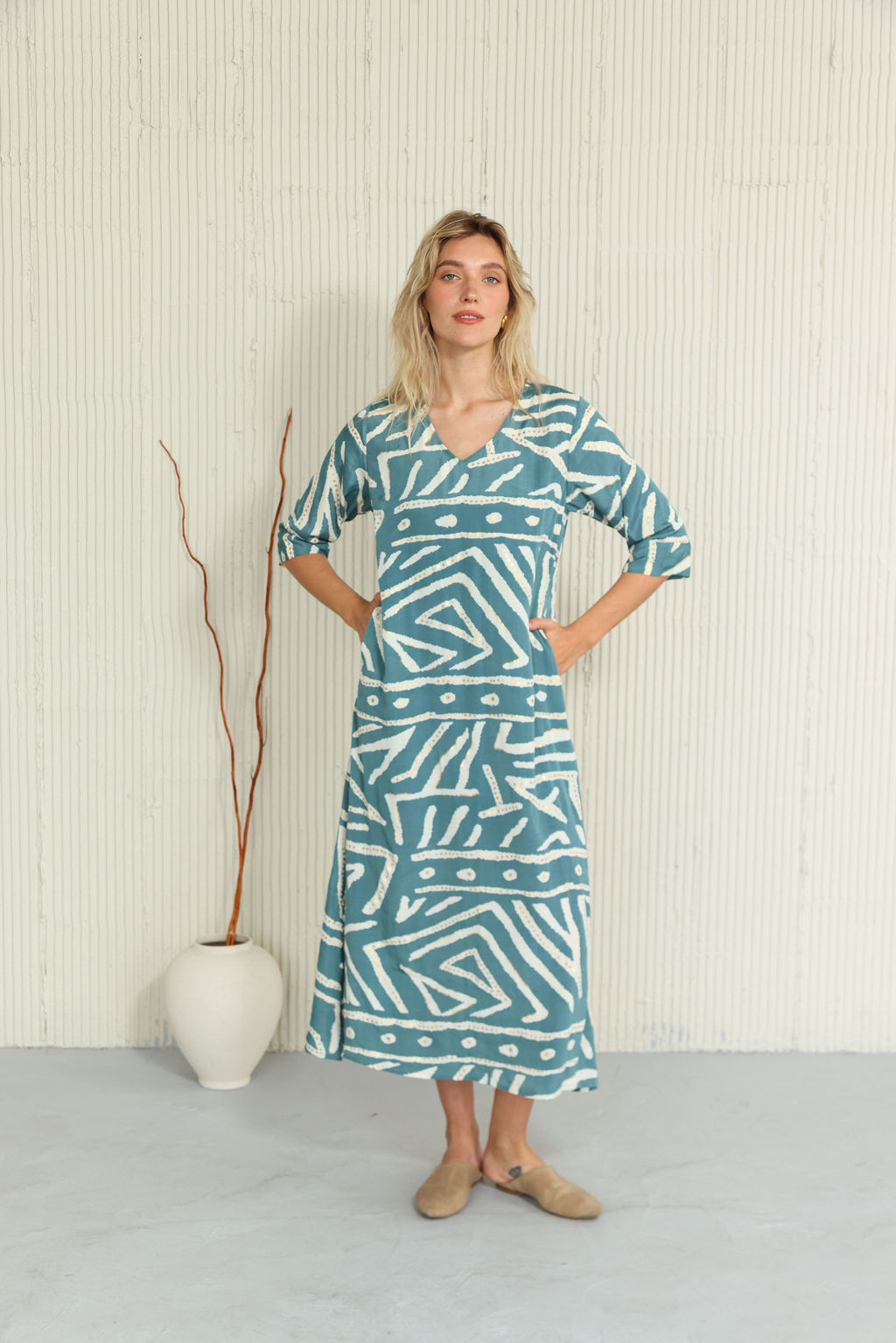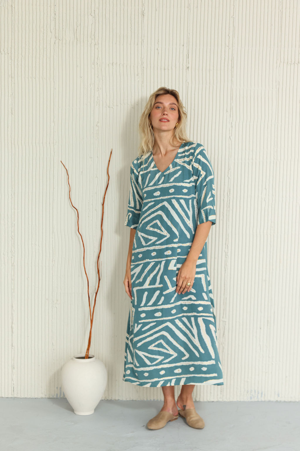 גוון תכלת של ים בשילוב פרינט גאומטרי שתמיד עובד עם נגיעות זהב