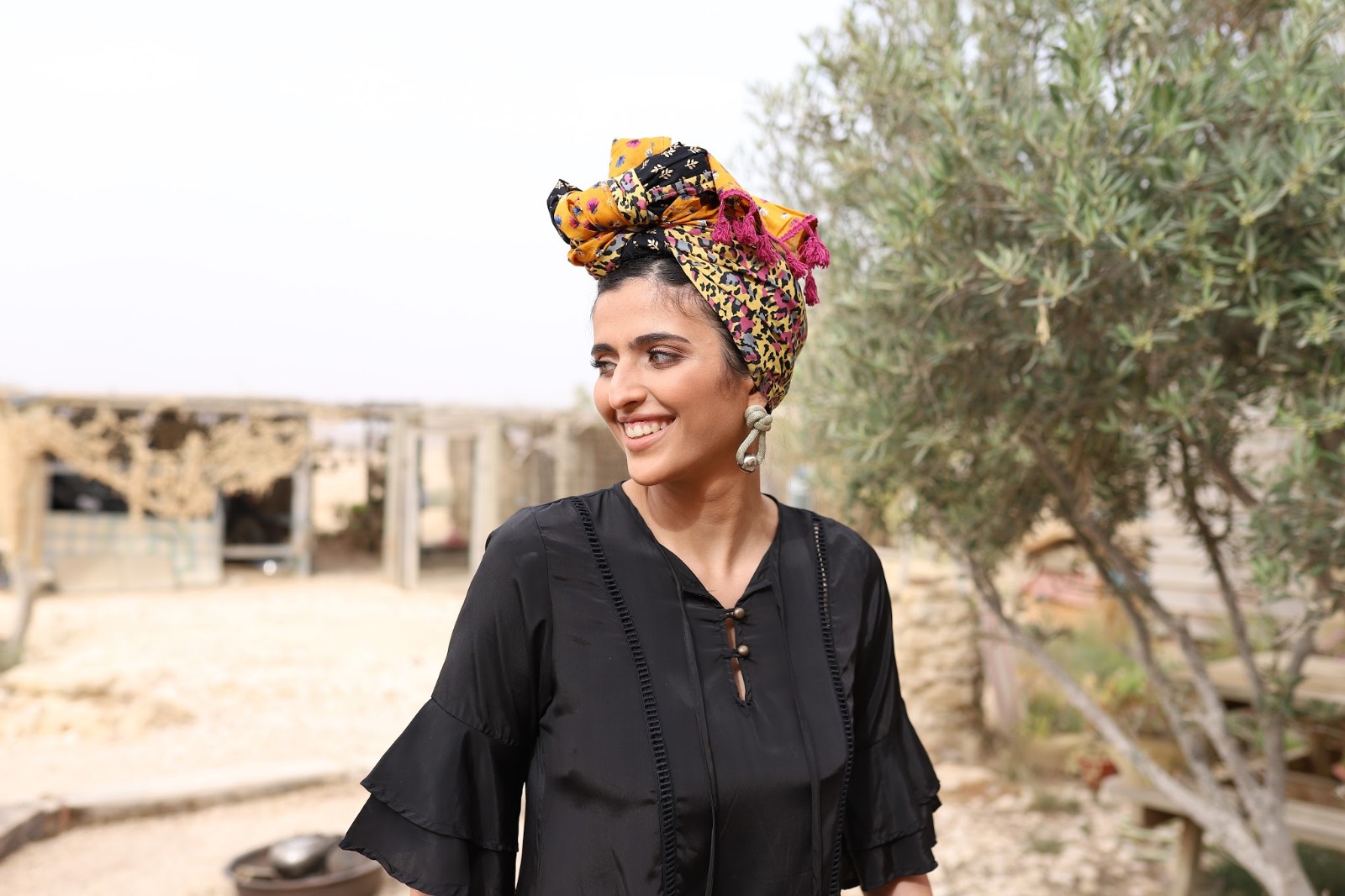 With games of mottled animal print in shades of yellow and purple combined with black cotton fabric with gold plates
